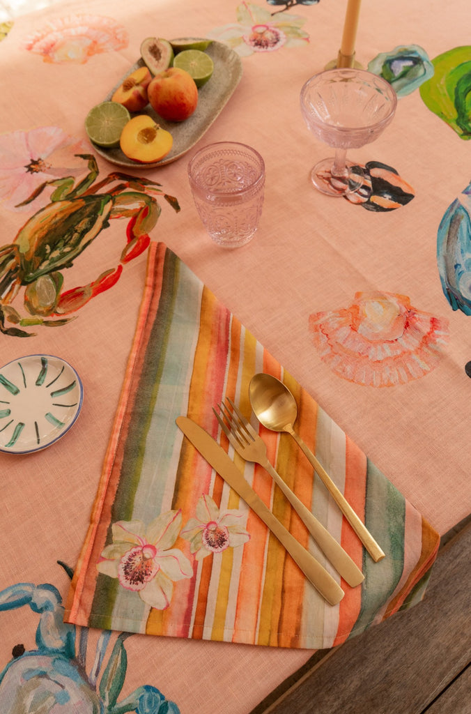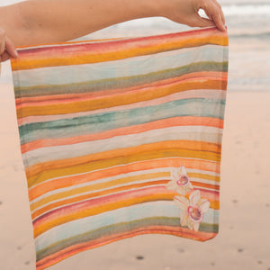 Our Seaside Stripe is part of our Artist Series, featuring Annie Everingham’s hand-painted artwork. Soft watercolour stripes are accented with a delicate painterly tropical orchid in one corner, capturing the serene magic of the seaside. Digitally printed on 100% organic cotton for a beautifully soft, sustainable finish.