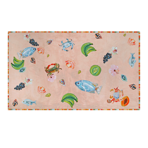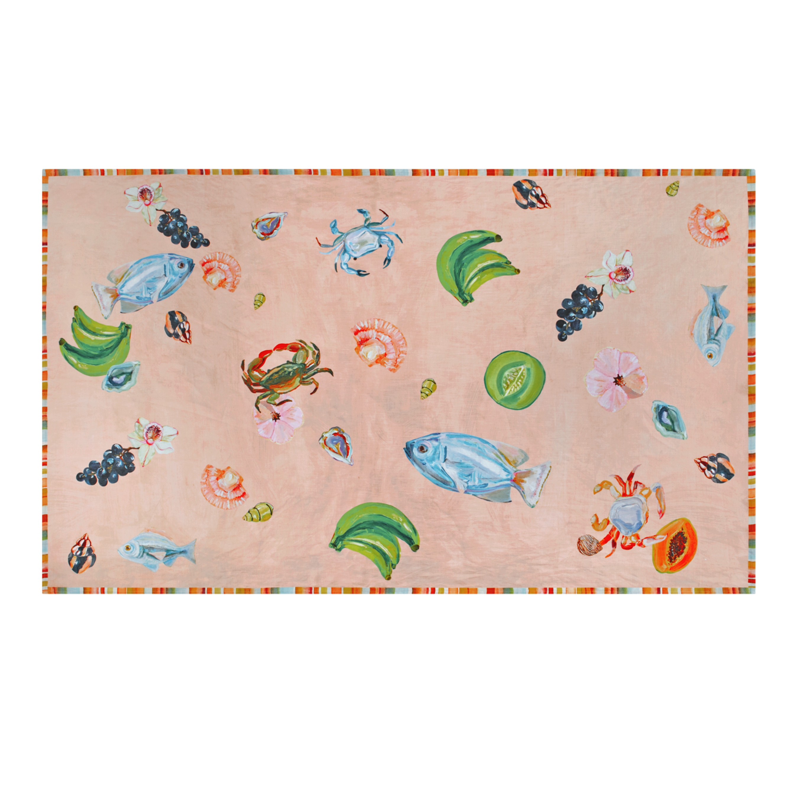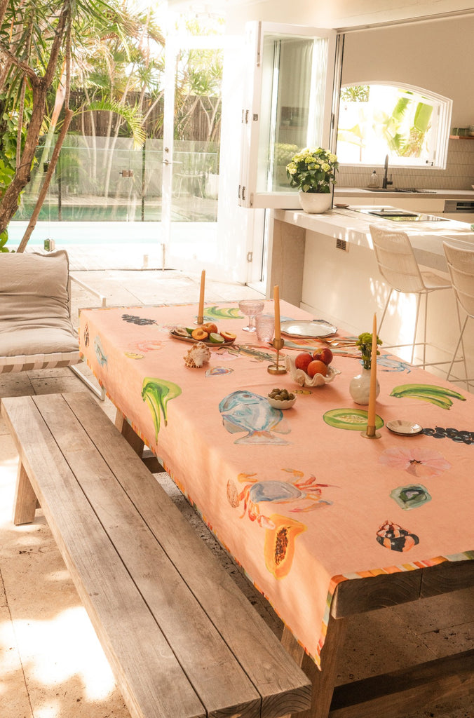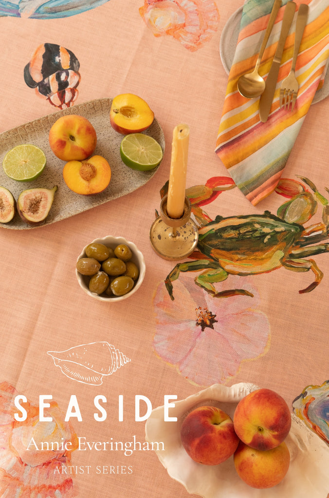 Our Pastel Sea Tablecloth is part of our Artist Series, showcasing Annie Everingham’s hand-painted artwork. Painterly pastels and expressive brushstrokes evoke the serene beauty of the seaside, with shells, fruits, fish, and tropical orchid motifs layered over a soft peach-wash background. A colourful watercolour stripe border frames the artwork, digitally printed on a luxurious linen and TENCEL™ blend that drapes beautifully for effortless elegance.