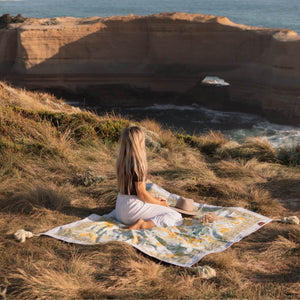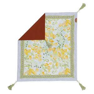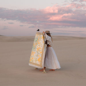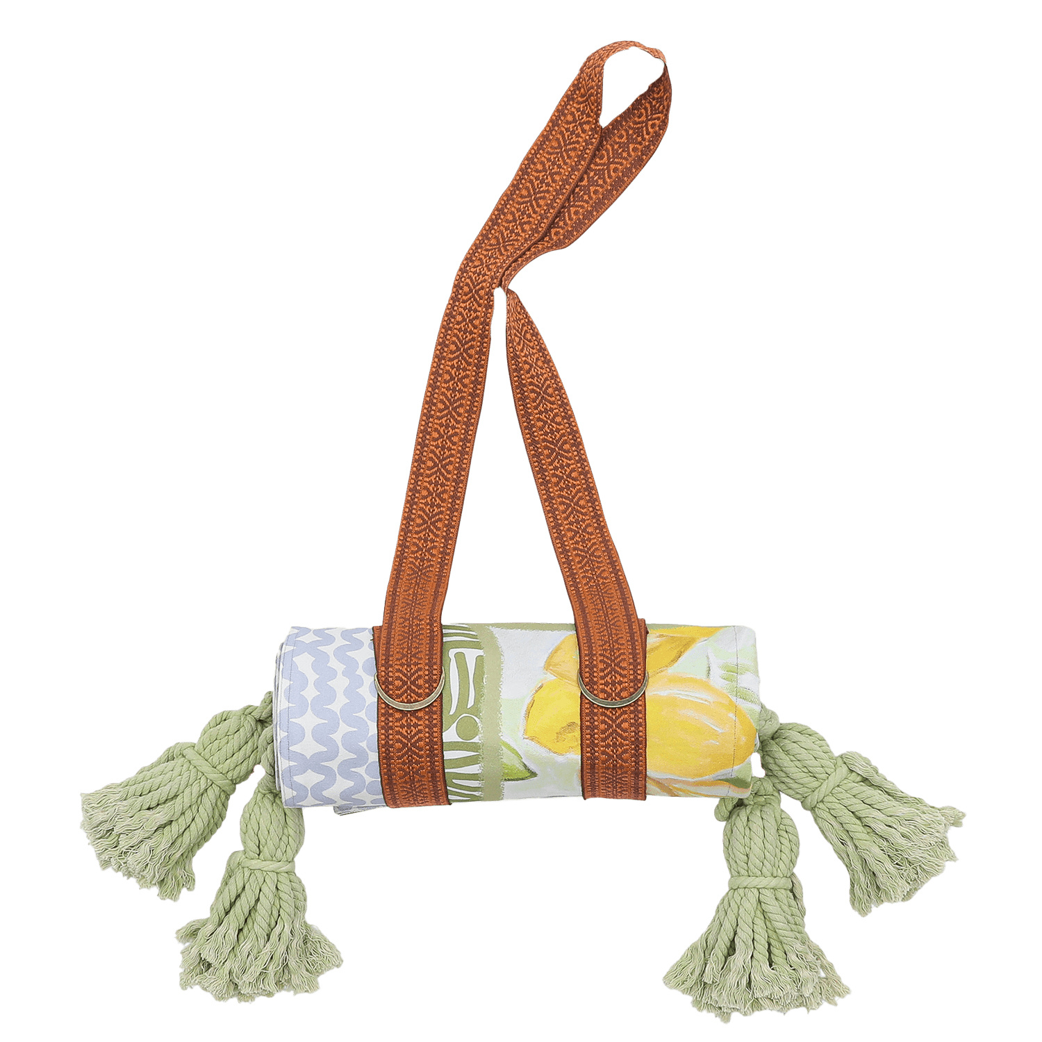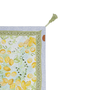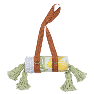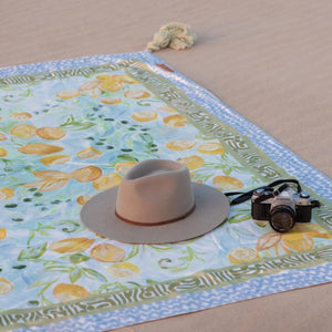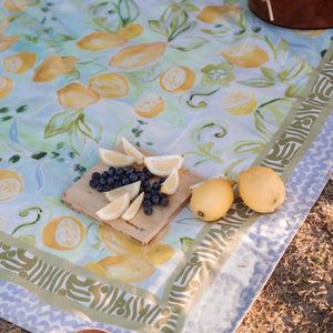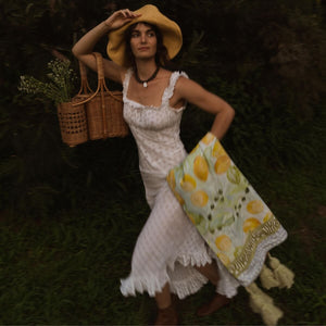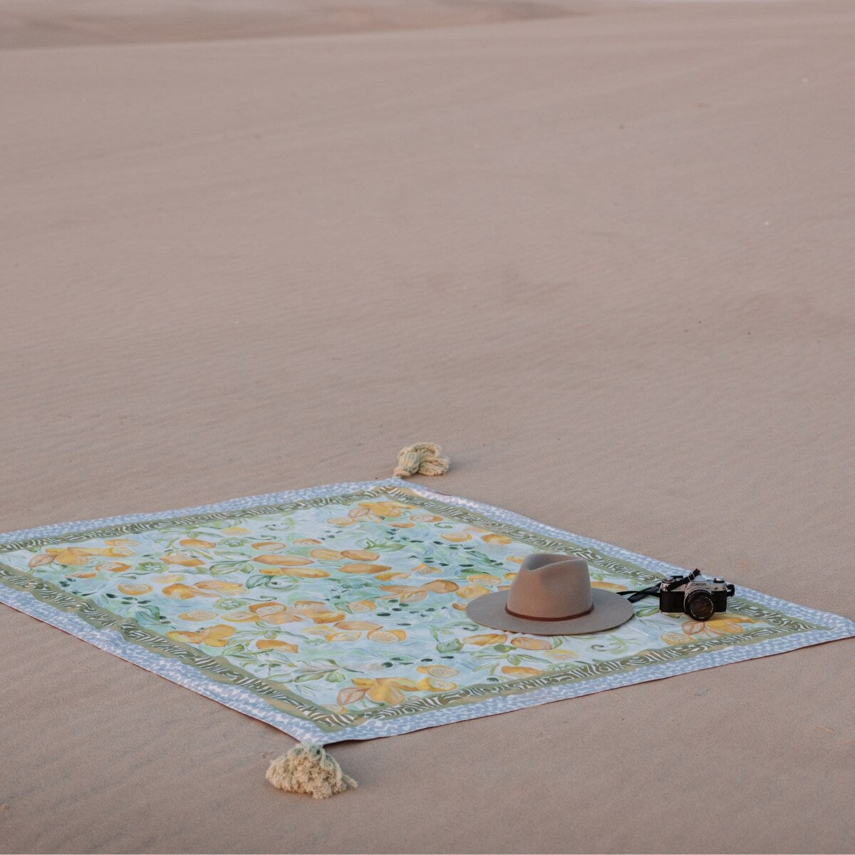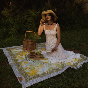 The Le Lemon Picnic Rug features a hand drawn design imbued with the memory of balmy late summer nights on the Amalfi coastline.