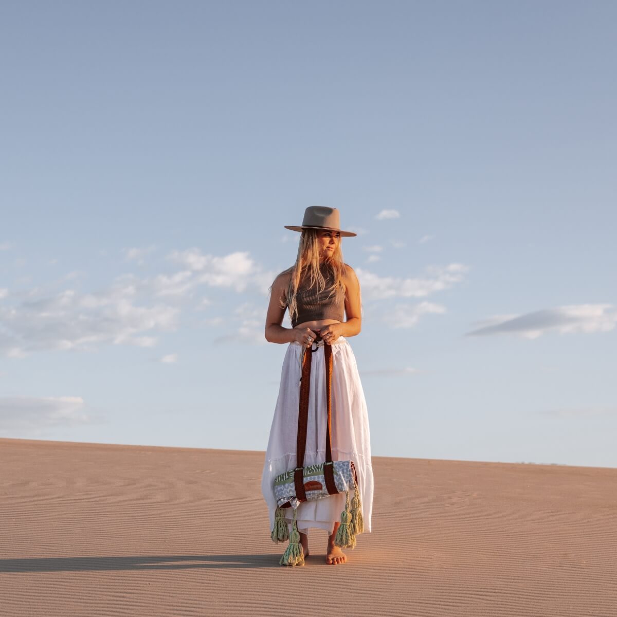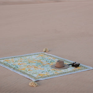 Printed on our NEW 100% recycled PET canvas that’s fade proof and water resistant. The base is a water resistant poly/cotton canvas. Framed by large cotton tassels in each corner, and comes and ornate brown woven carry strap.