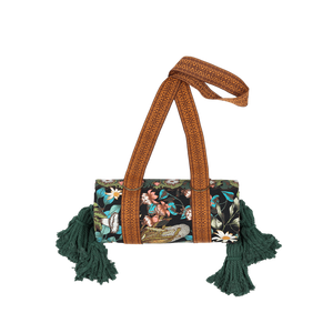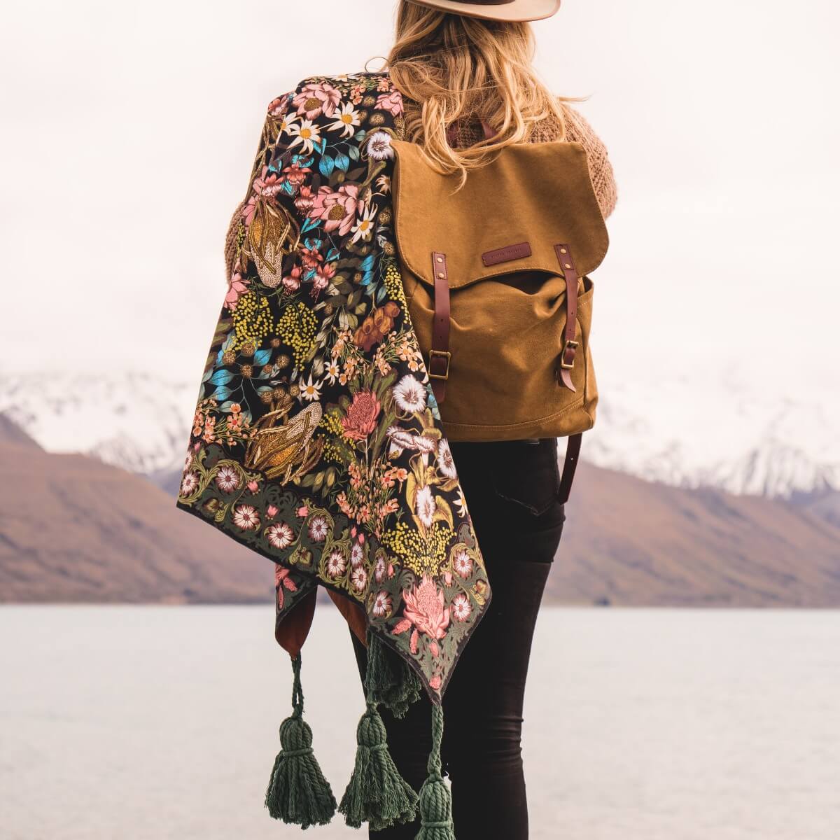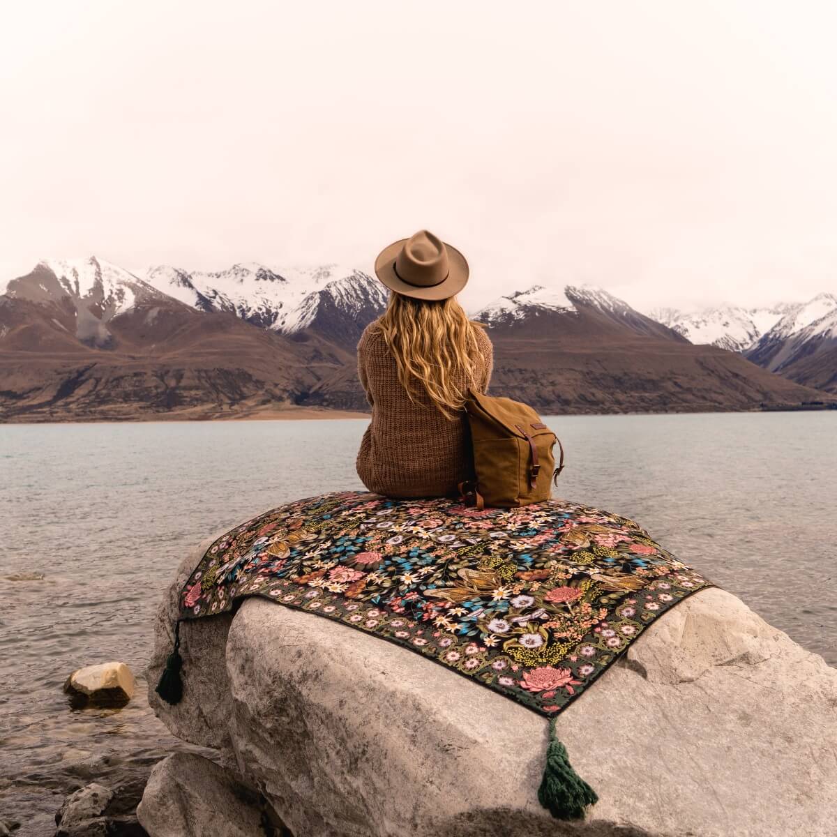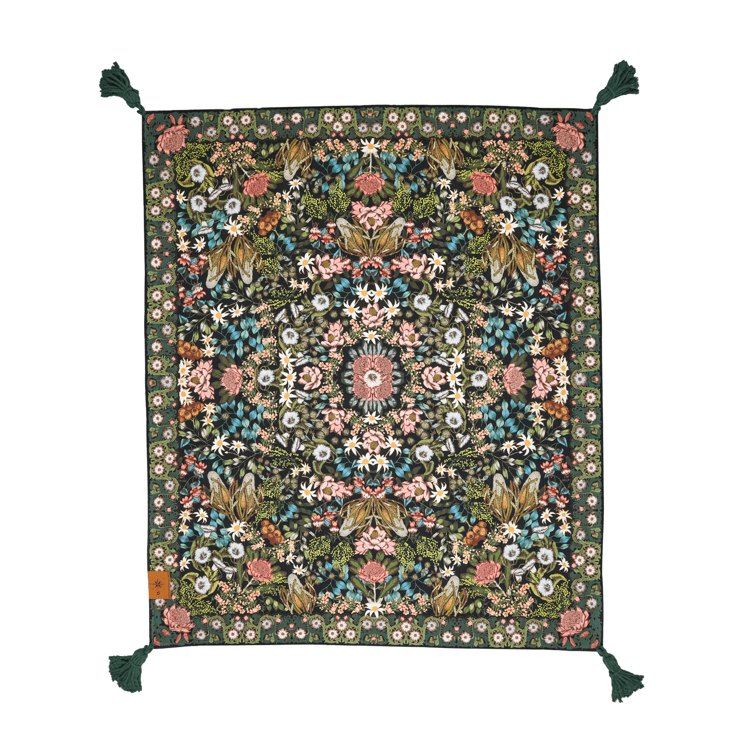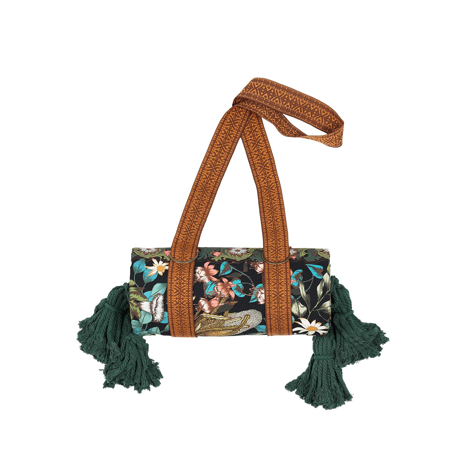 Printed on our durable 100% recycled PET canvas that's fade proof and water resistant. The base features our trusty brown water resistant poly/cotton canvas with a waterproof treatment. Framed by large cotton tassels in each corner to keep your rug weighed down, and lastly it comes with a handy ornate brown woven carry strap.