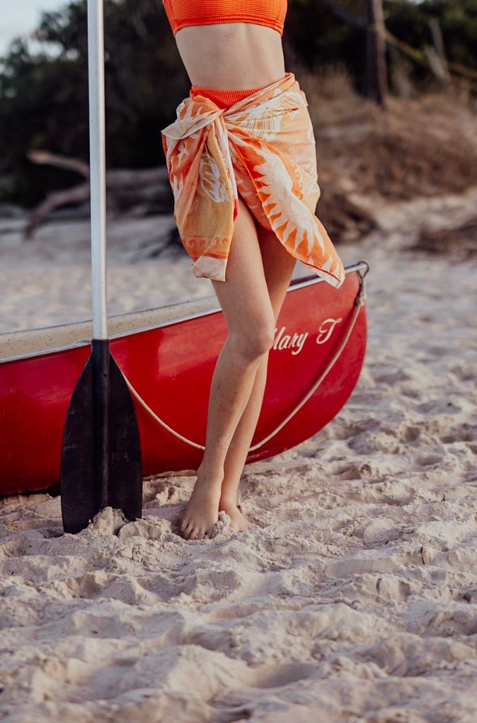 The Sol Sarong features the hand painted motifs inspired by days spent under the sun have been digitally printed on a semi-sheer light weight 100% cotton voile that offers the perfect coverage and drape for days spent by the beach.