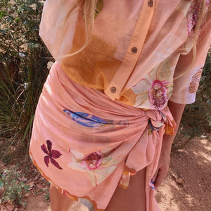 Our Pastel Sea Sarong is part of our Artist Series, featuring Annie Everingham’s hand-painted artwork. Painterly pastels and expressive brushstrokes capture the quiet magic of the seaside, shells, fruits, fish, and tropical orchid motifs layered over a soft peach-wash background. A colourful watercolour stripe border frames the artwork, digitally printed on a semi-sheer, lightweight cotton voile.
