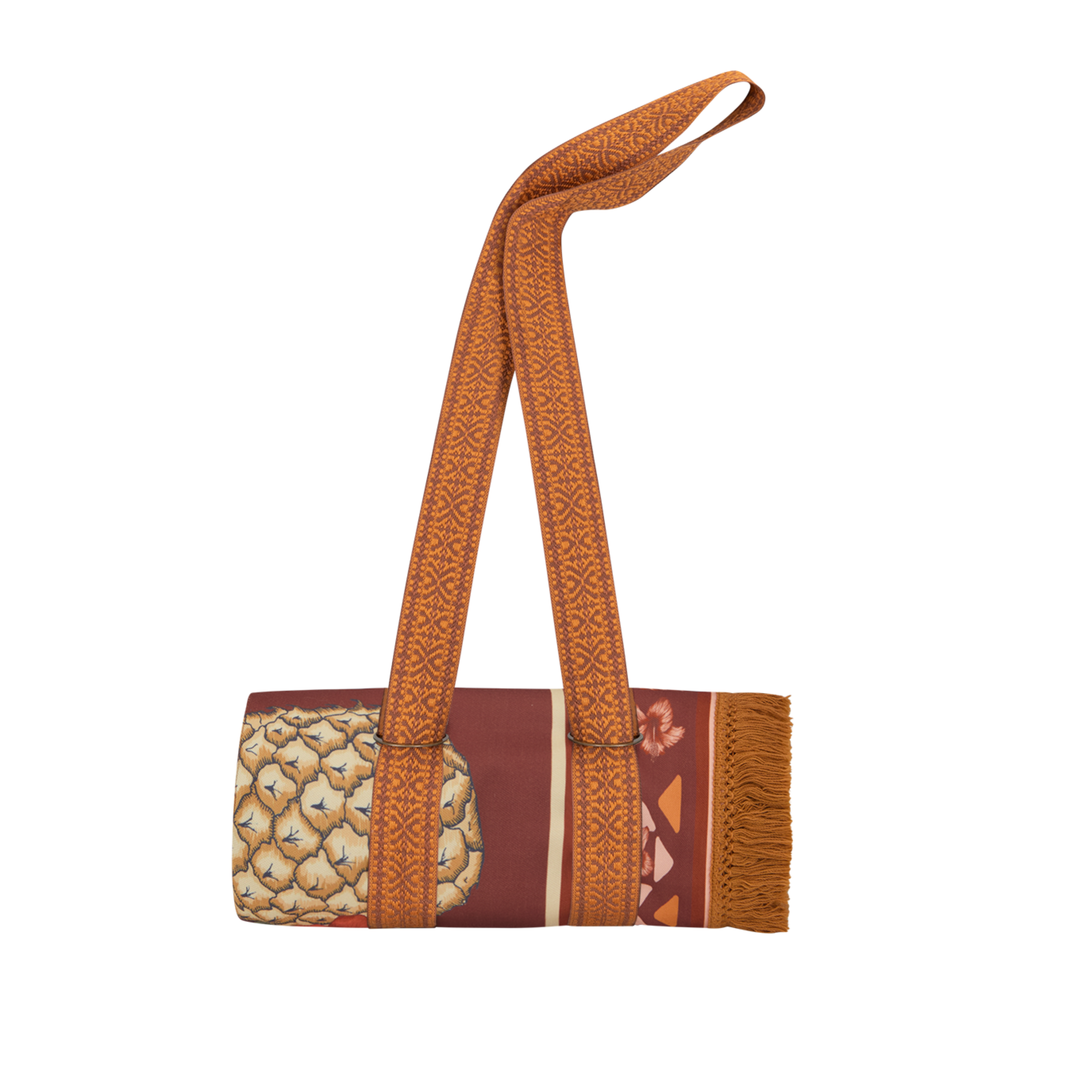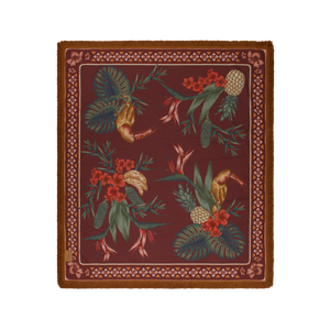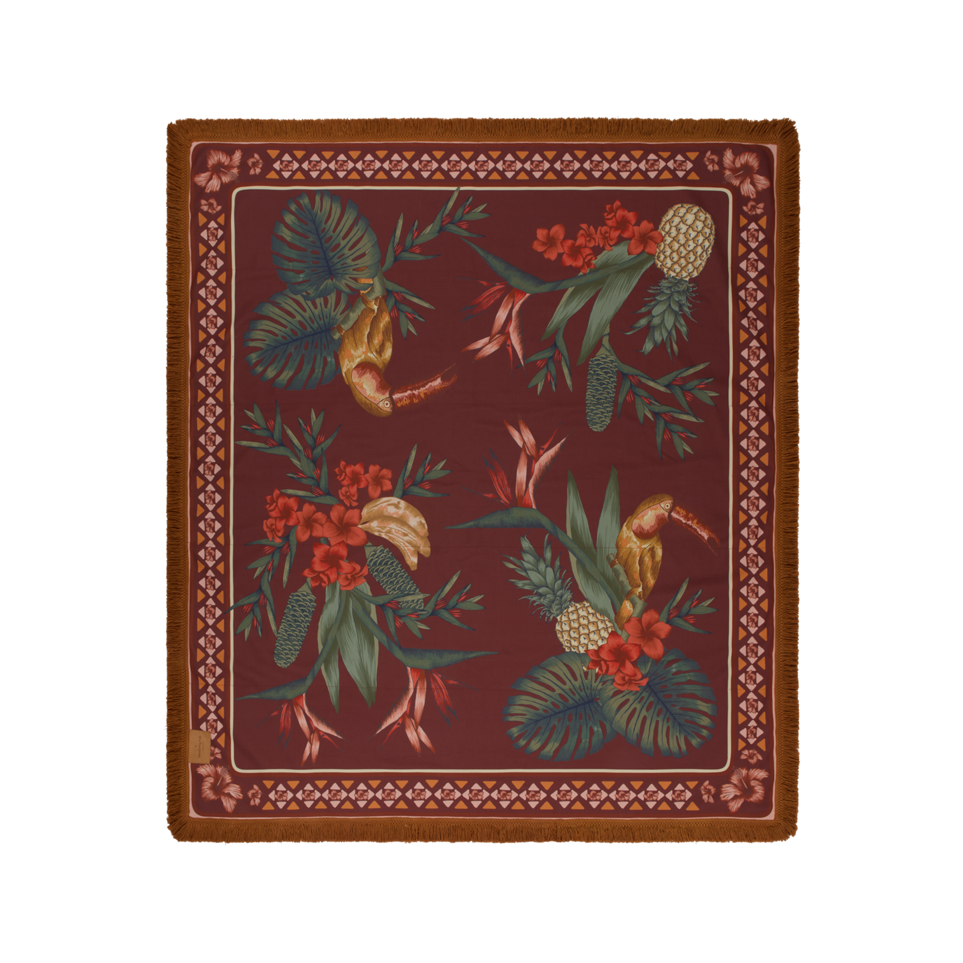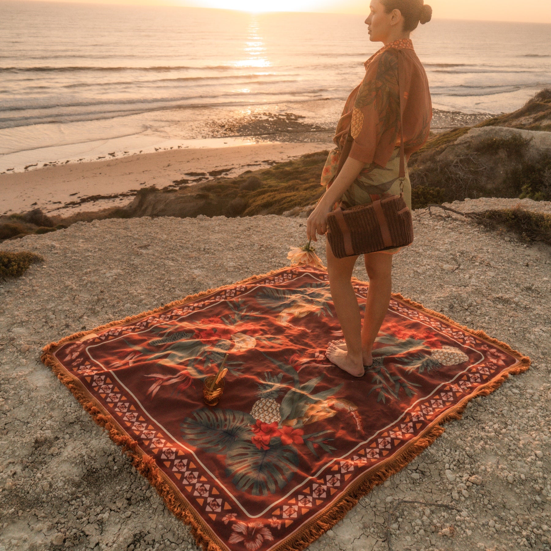 Featuring a hand-drawn, vintage Cuban-inspired floral design. Bursting with tropical charm and nostalgic flair, toucans, pineapples, and bird of paradise bloom across fabric made from recycled PET (plastic bottles) rich browns, jungle greens with highlights of coral reds. Edges of picnic rug have a dark brown cotton fringe for that vintage feel.