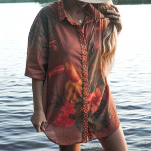 Made from soft organic cotton, this shirt features hand-drawn tropical motifs — toucans, gold pineapples, and bird of paradise flowers.