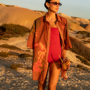 Bold and sun-soaked, Cuban Tropical is a vibrant collection inspired by Havana days and tropical nights. Playful toucans, golden pineapples, and bird of paradise bloom across hand-drawn prints in rich coffee browns, jungle greens, and coral reds.