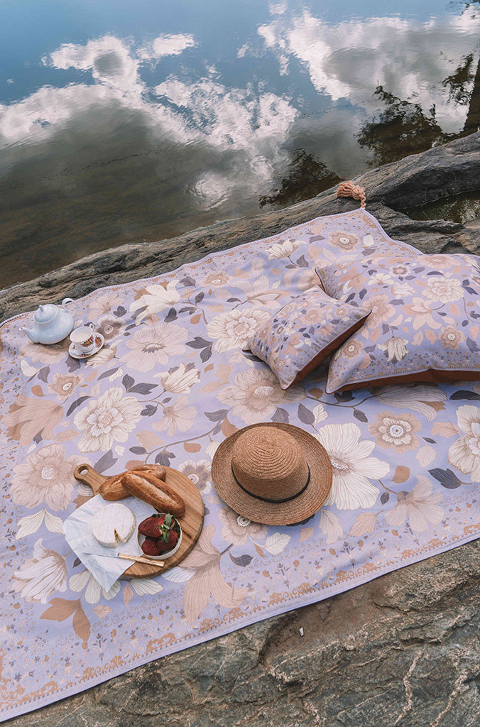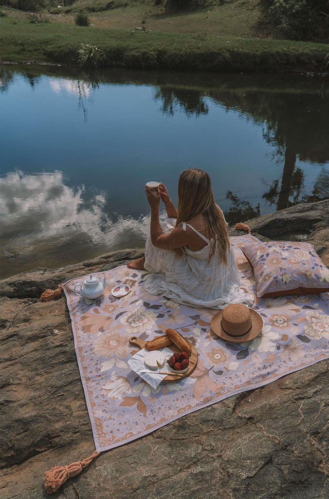 The durable cotton canvas surface is adorned with hand illustrated prints by our founder Sharnee Thorpe. Our cushions each feature a protective water resistant base, so you can style your picnic set up any way you like!