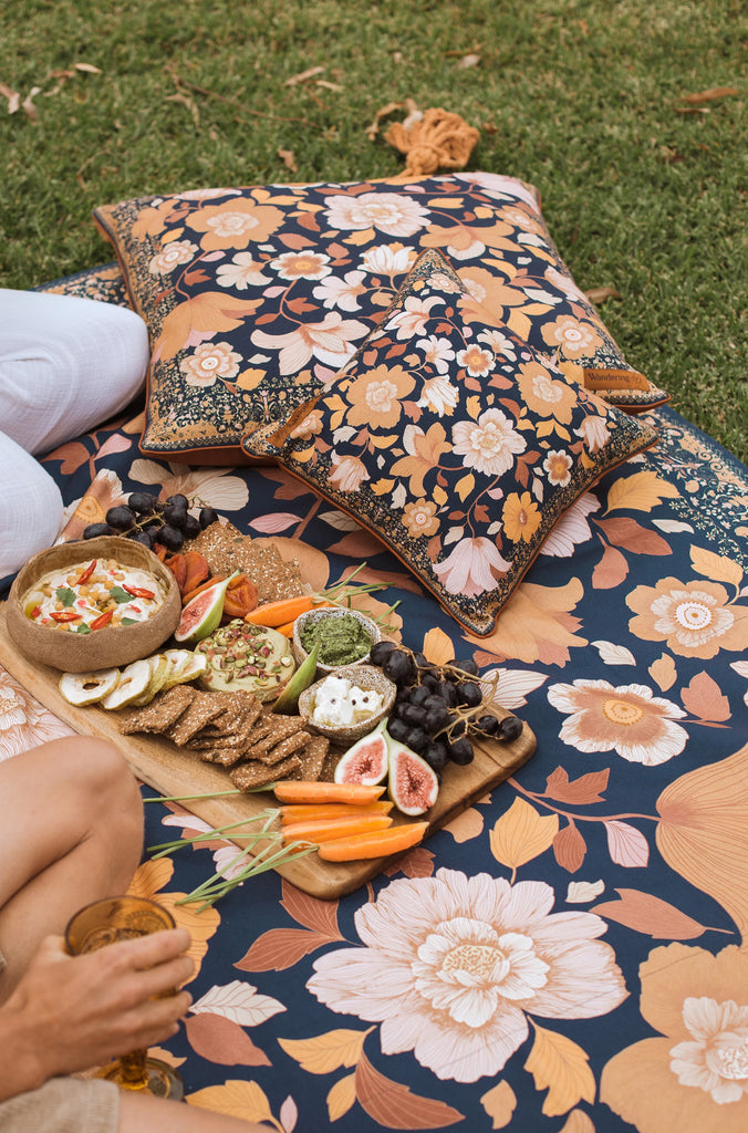 The durable cotton canvas surface is adorned with hand illustrated prints by our founder Sharnee Thorpe. Our cushions each feature a protective water resistant base, so you can style your picnic set up any way you like!