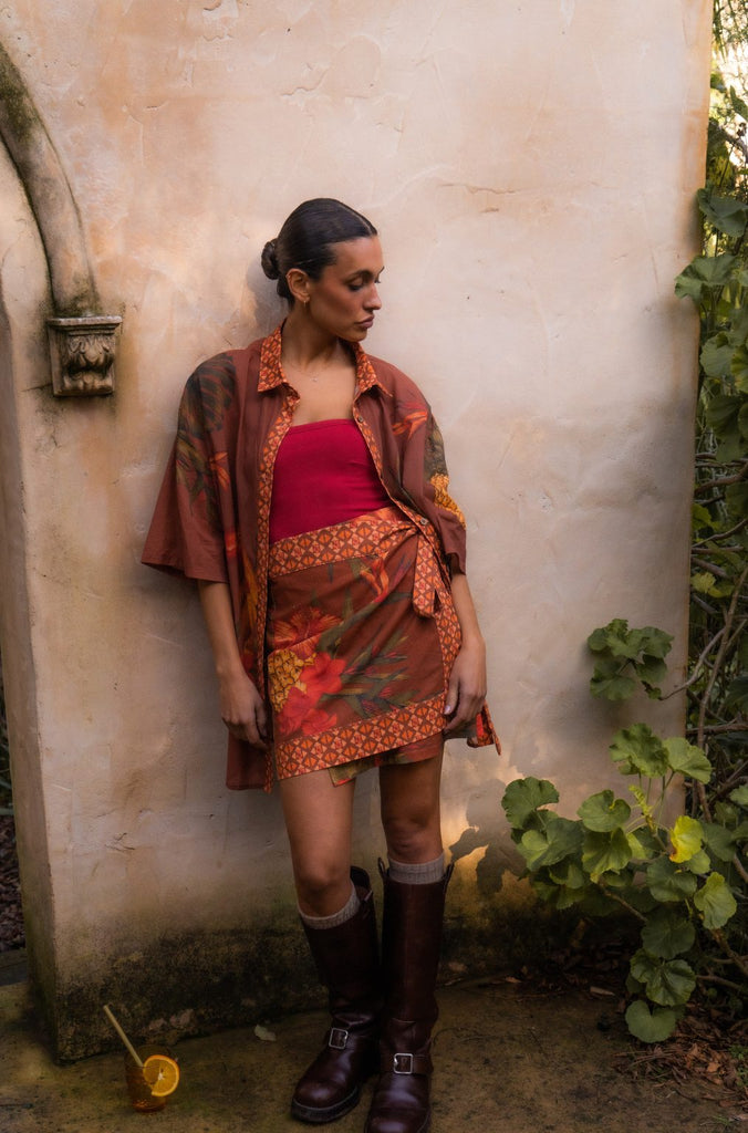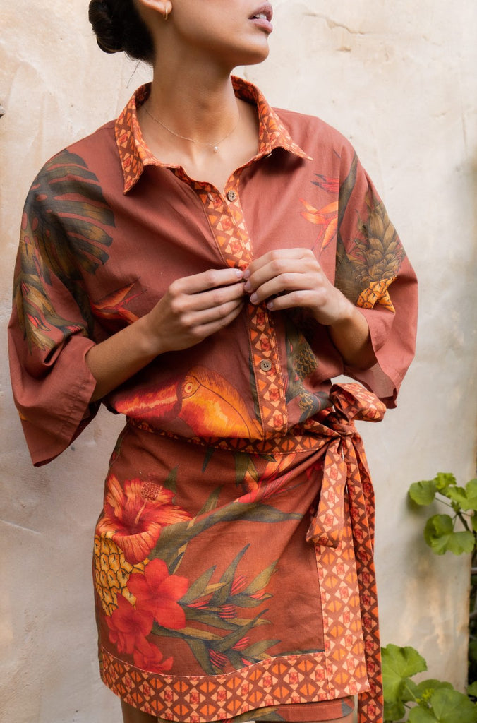 Our Cuban Tropical wrap skirt, crafted in a cotton-linen blend bursting with hand-drawn island flair. Tropical toucans, pineapples, and bird of paradise flowers bloom across a rich palette of coffee browns, jungle greens, and vibrant coral reds.