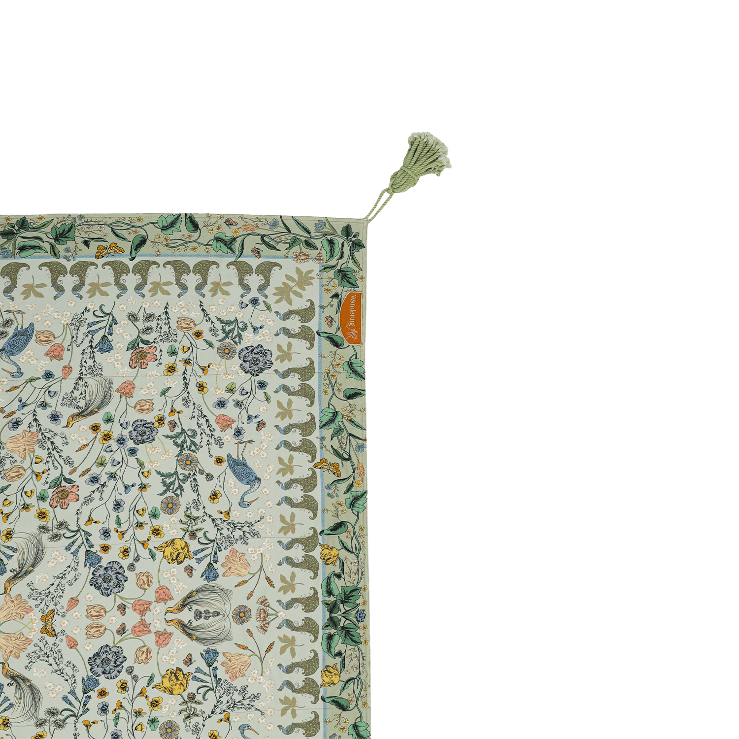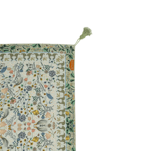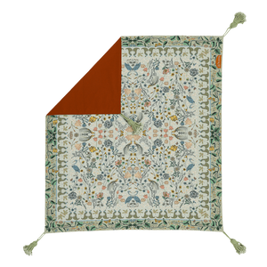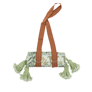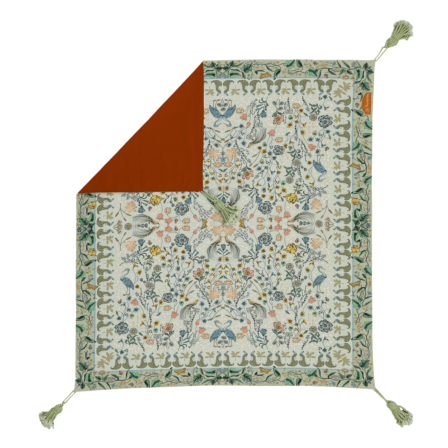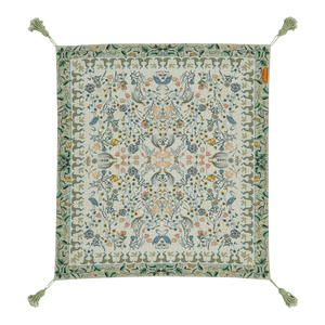 Wonderland is one of our best selling rugs. Printed on our NEW renewable and durable 100% recycled PET canvas that is fade proof and water resistant. The base features our trusty brown water resistant poly/cotton canvas with a waterproof treatment. Framed by large cotton tassels in each corner, and comes and ornate brown woven carry strap.