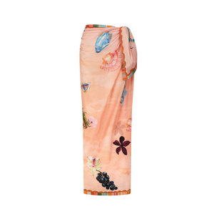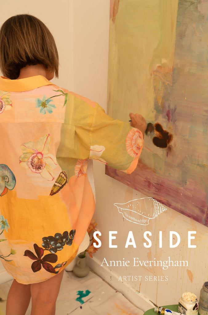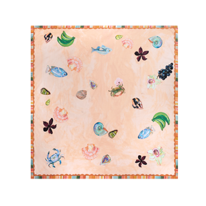 Our Pastel Sea Sarong is part of our Artist Series, featuring Annie Everingham’s hand-painted artwork. Painterly pastels and expressive brushstrokes capture the quiet magic of the seaside, shells, fruits, fish, and tropical orchid motifs layered over a soft peach-wash background. A colourful watercolour stripe border frames the artwork, digitally printed on a semi-sheer, lightweight cotton voile.