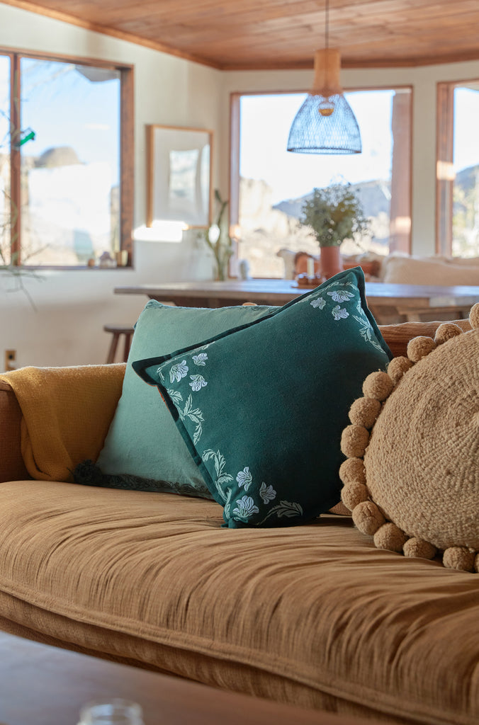This cushion cover is made from a beautiful hemp blend fabrication with a soft hand feel, featuring floral embroidery detail and a 100% recycled PET water resistant base making it perfect for indoor and outdoor use.